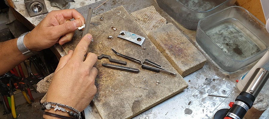 Una volta pronte, le perle vengono affidate ad Alessandro, che le incastona in montature in oro o argento lavorate a mano. Il design viene studiato per esaltare la luce dell’acqua e garantire comfort e resistenza nel tempo.