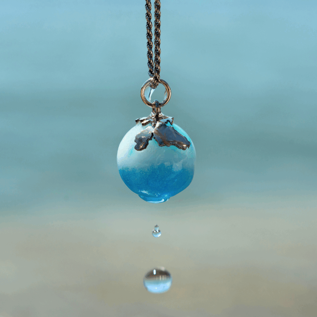 Elisa Boccia, artista poliedrica elbana, si occupa della trasformazione dell’acqua di mare: goccia dopo goccia, attraverso un processo accurato, l’acqua viene cristallizzata e preparata per diventare il cuore dei nostri gioielli.