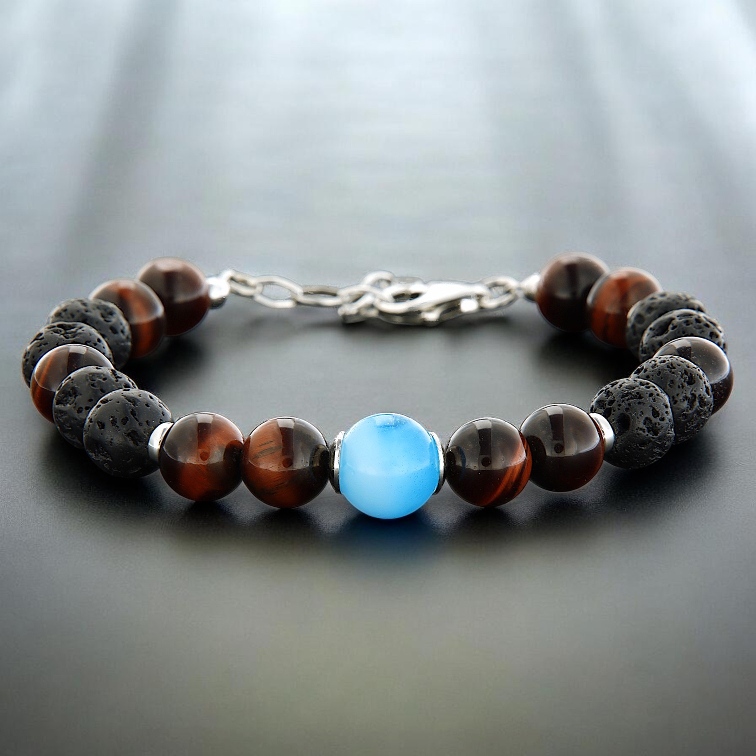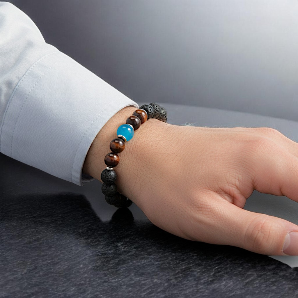 Bracciale Uomo “Pietra Dure” (pietra lavica ed occhio di tigre) con Perla Blu Edition realizzata con acqua di mare cristallizzata dell’isola d’Elba. Inserti e catena in Argento 925.
